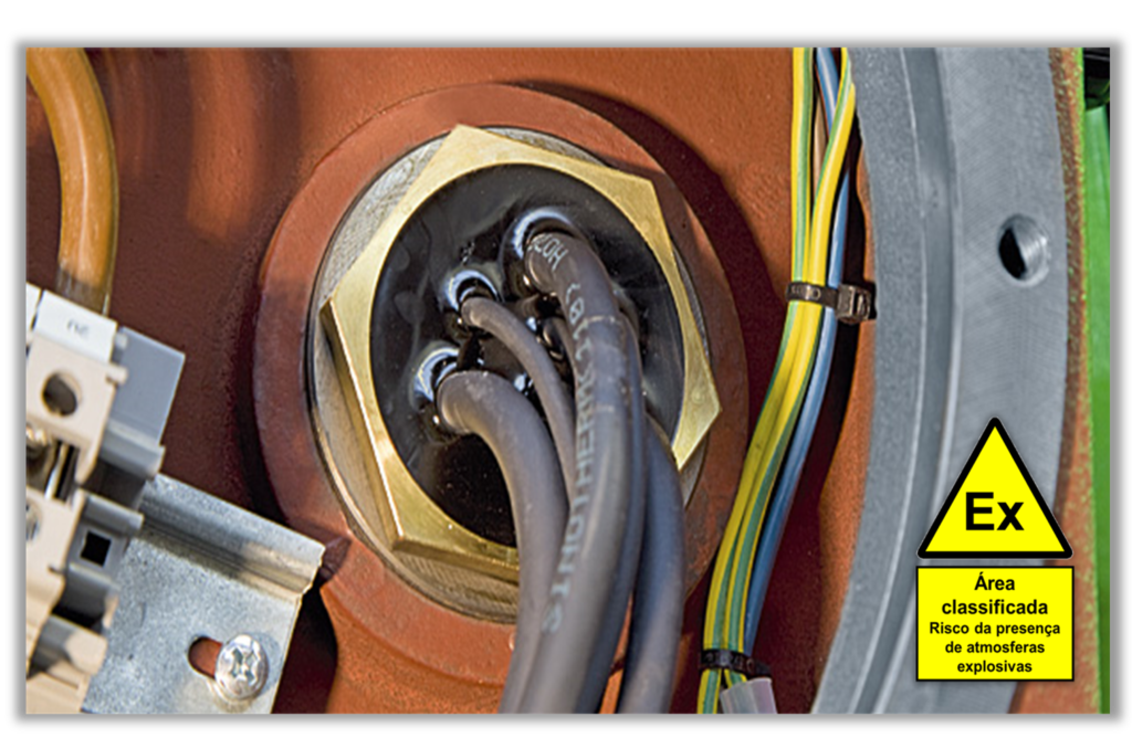 Exemplo de instalação de equipamento “Ex” incorporando a combinação dos tipos de proteção Ex “db” e Ex “eb”, constituído por invólucro metálico do tipo “à prova de explosão” Ex “db” (contendo internamente componentes centelhantes) e por caixa de terminais do tipo “segurança aumentada” (Ex “eb”), na parte inferior, com sistema de entradas INDIRETAS de cabos através de buchas seladas para passagem de cabos (bushings). Equipamento “Ex” completo certificado para instalação em atmosferas explosivas, com marcações Ex db eb IIC T5 Gb / Ex tb IIIC T100ºC Db