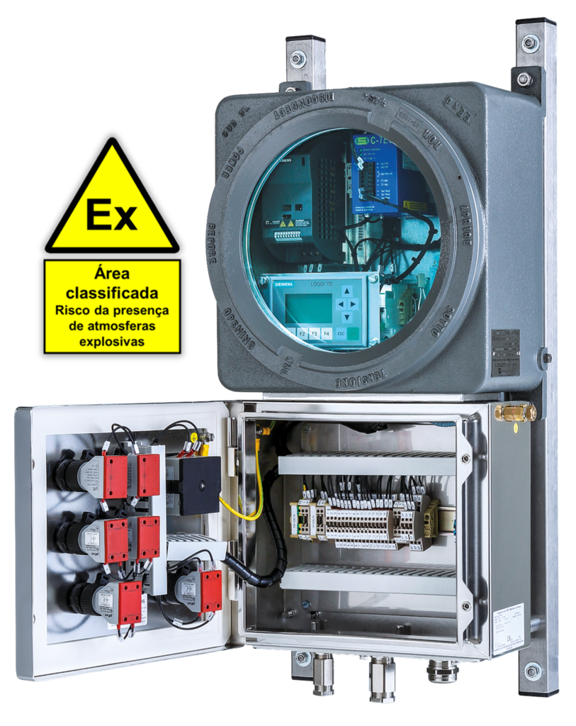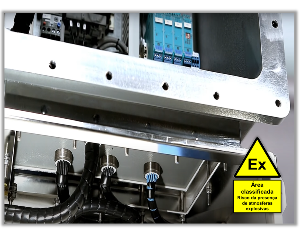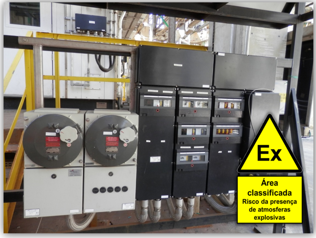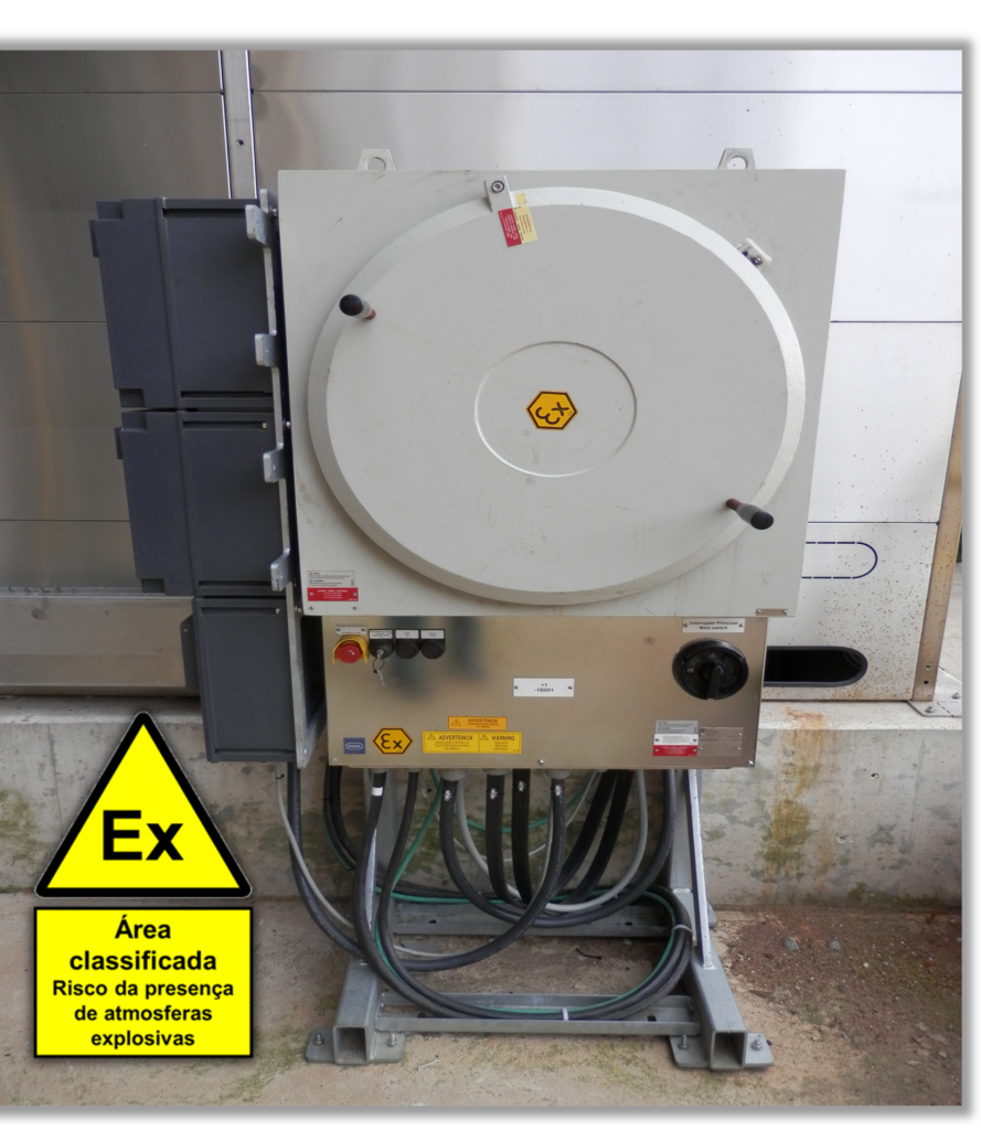 Exemplo de instalação (do lado esquerdo) de equipamento “Ex” incorporando a combinação dos tipos de proteção Ex “db” e Ex “eb”, constituído por invólucro metálico do tipo “à prova de explosão” Ex “db” (contendo internamente componentes centelhantes) e por caixa de terminais do tipo “segurança aumentada” (Ex “eb”), com sistema de entradas INDIRETAS de cabos através de buchas seladas para passagem de cabos (bushings). Do lado direito pode ser visto painéis de distribuição de circuitos de força, com invólucros plásticos, contendo internamente dispositivos centelhantes (disjuntores e contatores) individualmente certificados (Ex db eb IIC Gb U). Equipamento “Ex” completo certificado para instalação em atmosferas explosivas, com marcações Ex db eb IIC T4 Gb / Ex tb IIIC T135ºC Db