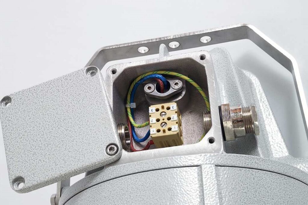 Exemplo de instalação de equipamento “Ex” incorporando a combinação dos tipos de proteção Ex “db” e Ex “eb”, constituído por invólucro metálico do tipo “à prova de explosão” Ex “db” (contendo internamente componentes centelhantes) e por caixa de terminais do tipo “segurança aumentada” (Ex “eb”), instalada na parte inferior, com sistema de entradas INDIRETAS de cabos, através de buchas seladas para passagem de cabos (bushings). Na tampa da caixa de terminais Ex “e” pode ser vista a instalação de dispositivos centelhantes (botões de comando, sinaleiros e instrumentos de medição “Ex”) individualmente certificados (Ex db eb IIC Gb U). Equipamento “Ex” completo, certificado para instalação em atmosferas explosivas, com marcações Ex db eb IIC T4 Gb / Ex tb IIIC T135ºC Db